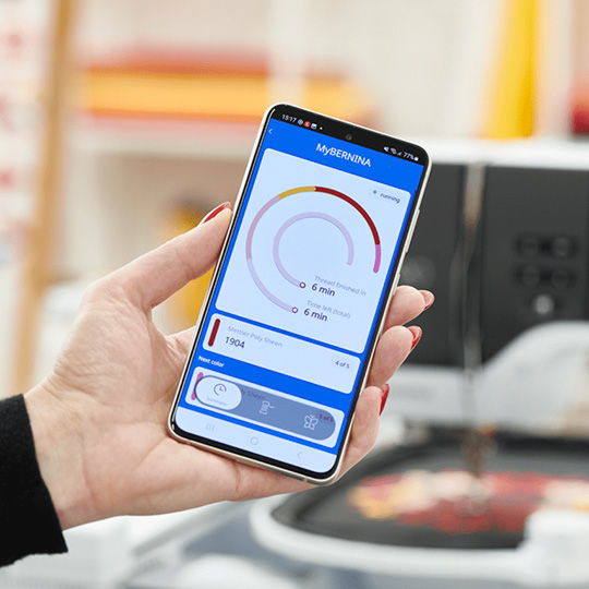 Загружайте дизайны прямо из программного обеспечения BERNINA 9 и следите за процессом вышивки с помощью приложения на смартфоне.